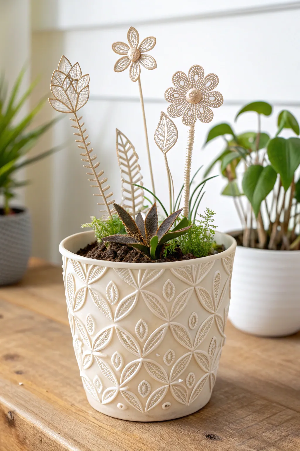 Add a personal touch to your planters with decorative elements. I love making little plant markers with quirky designs.