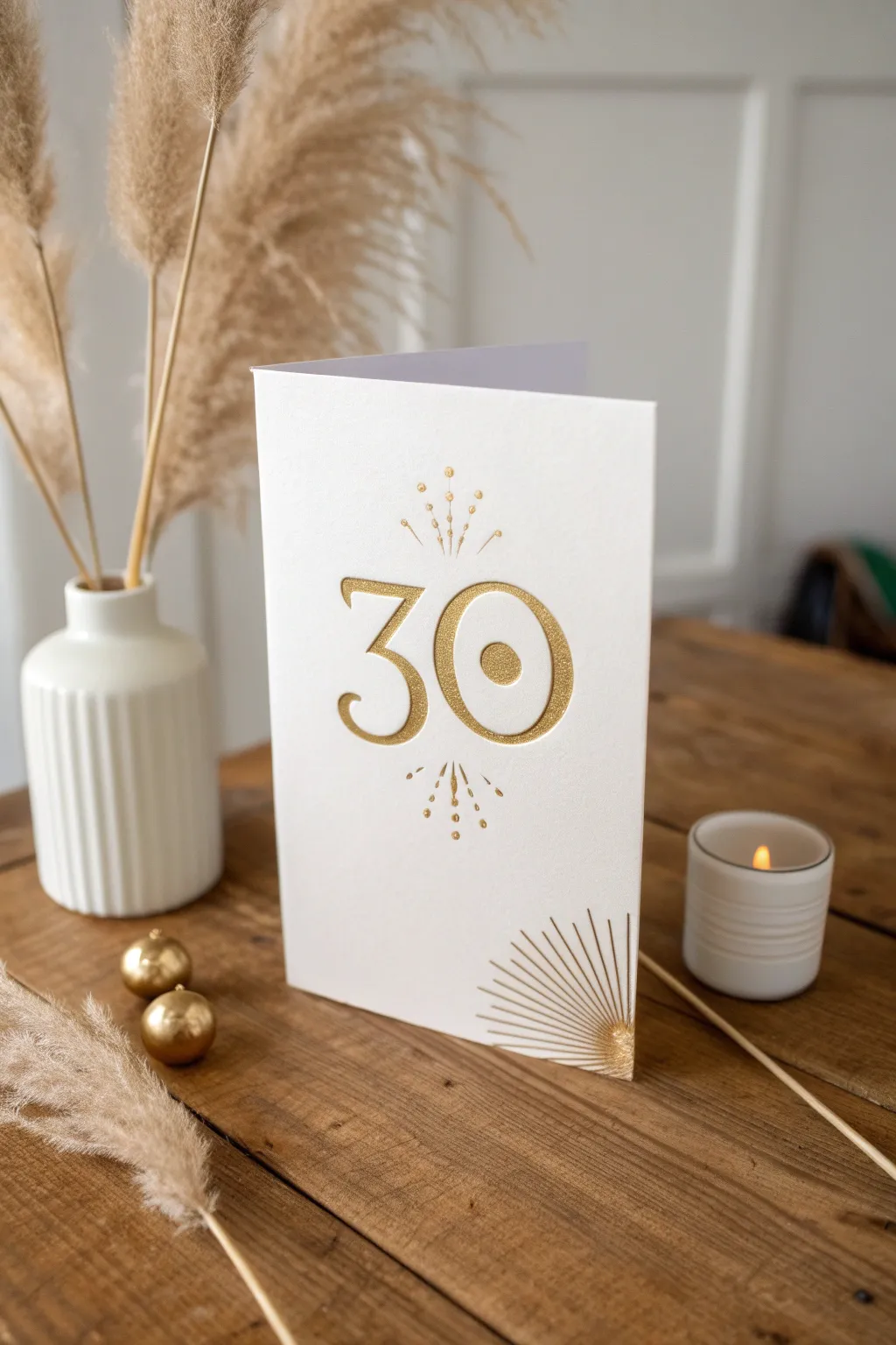 Celebrate the years with a bold numerical design. On my parents’ 30th, I crafted a card with a big shimmering ’30’ to mark the milestone.