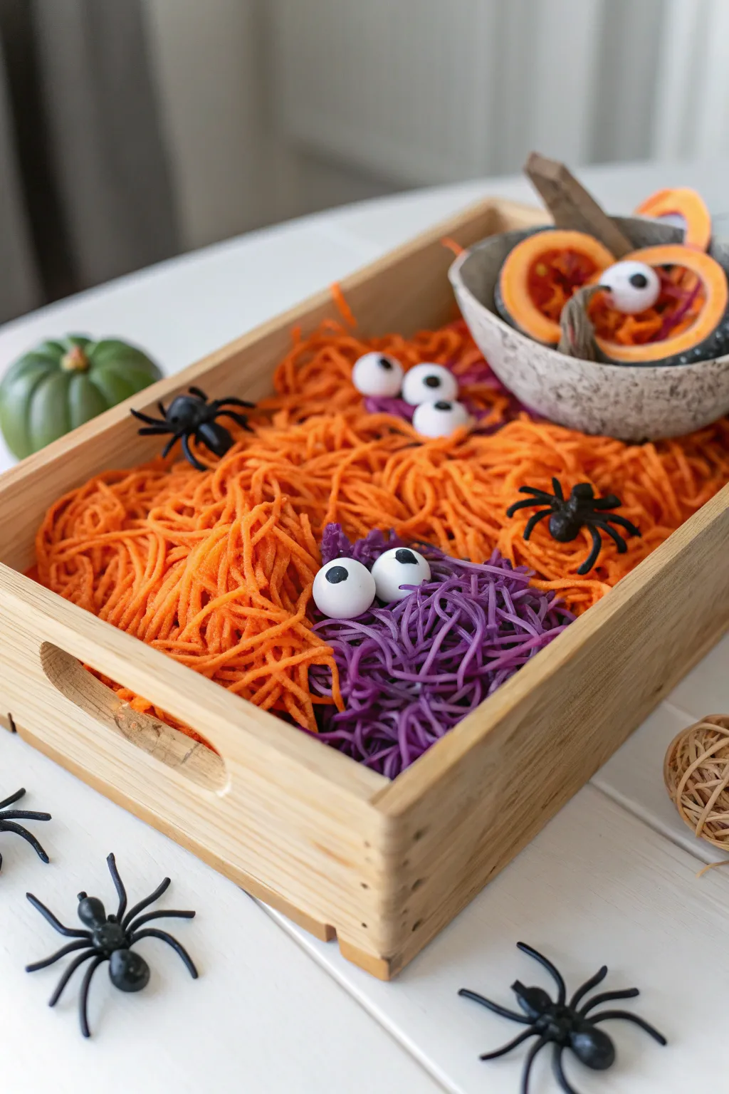Fill a bin with textured items like spaghetti, plastic spiders, and eyeballs for a sensory experience. It’s always a hit with curious little ones.