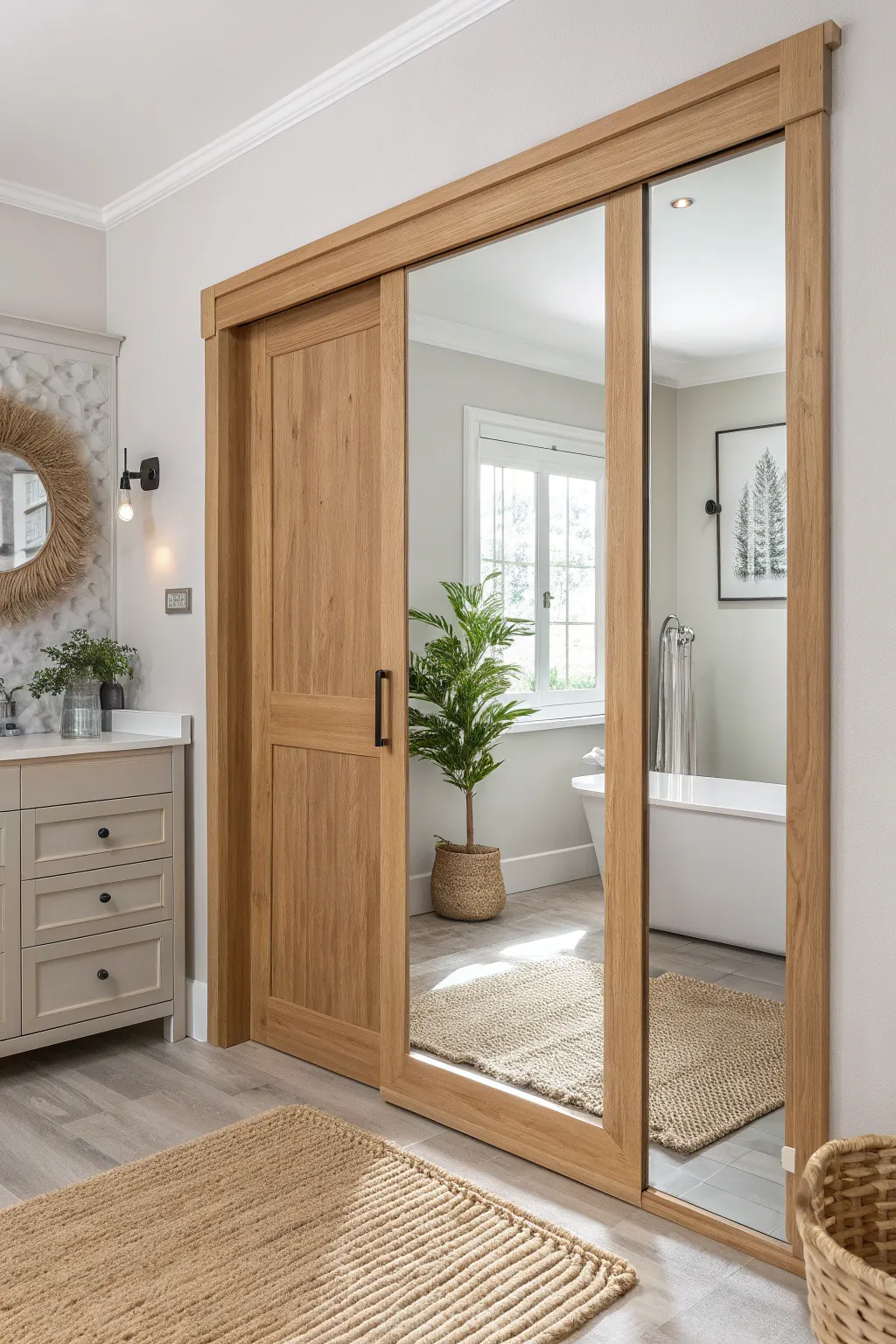 Transform your bathroom with the elegance and functionality of mirrored sliding doors, where minimalist design meets boho charm.