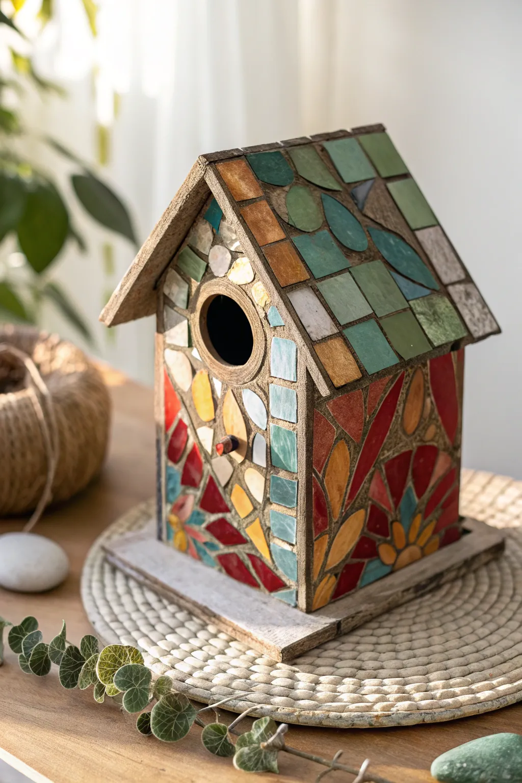 Cover a bird box with colorful mosaic tiles for a funky look. I love how the sunlight catches the tiles, creating a dazzling effect.