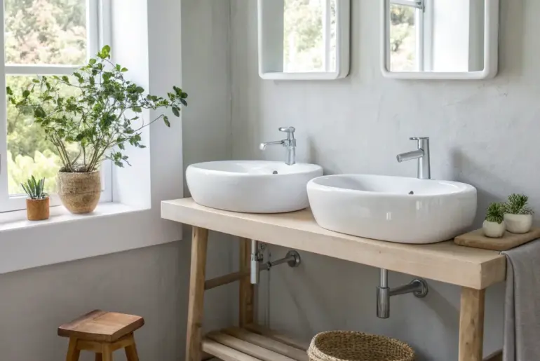 Transforming your bathroom into a stylish and functional space without a traditional cabinet can be a fun challenge. Let’s explore some creative ways to incorporate sinks into your bathroom that are both beautiful and practical. Install a Glass Sink Enhance your bathroom’s elegance with a minimalist glass sink that reflects beauty and light. A glass sink can add a touch of elegance and modernity. I used one in a client’s bathroom, and it reflected light…