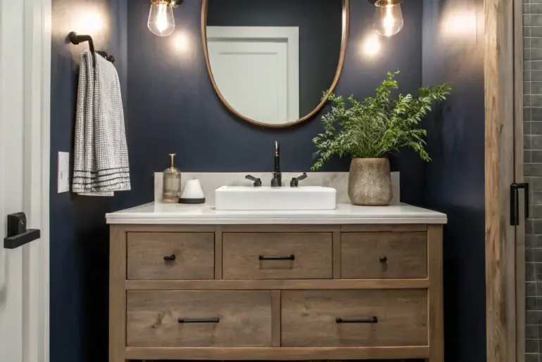 Dark vanities can transform any bathroom into a chic, elegant retreat. Let’s explore some stylish ideas to inspire your own bathroom makeover. Open Shelving for Functionality Open shelving adds style and functionality to your bathroom. #HomeDecor Add open shelving below your dark vanity to keep essentials within reach. It’s practical yet stylish, perfect for showcasing chic towels or baskets. #OpenShelving #BathroomEssentials 🛁 Consider these options: Woven Storage Baskets: Enhance your bathroom’s style with chic woven…