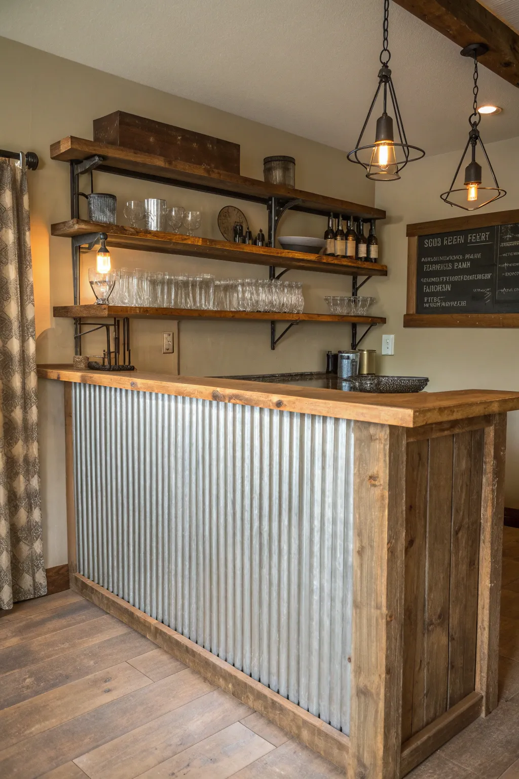 Combine corrugated metal with wood for a striking texture contrast. This mix made my bar not only sturdy but also an instant conversation starter.