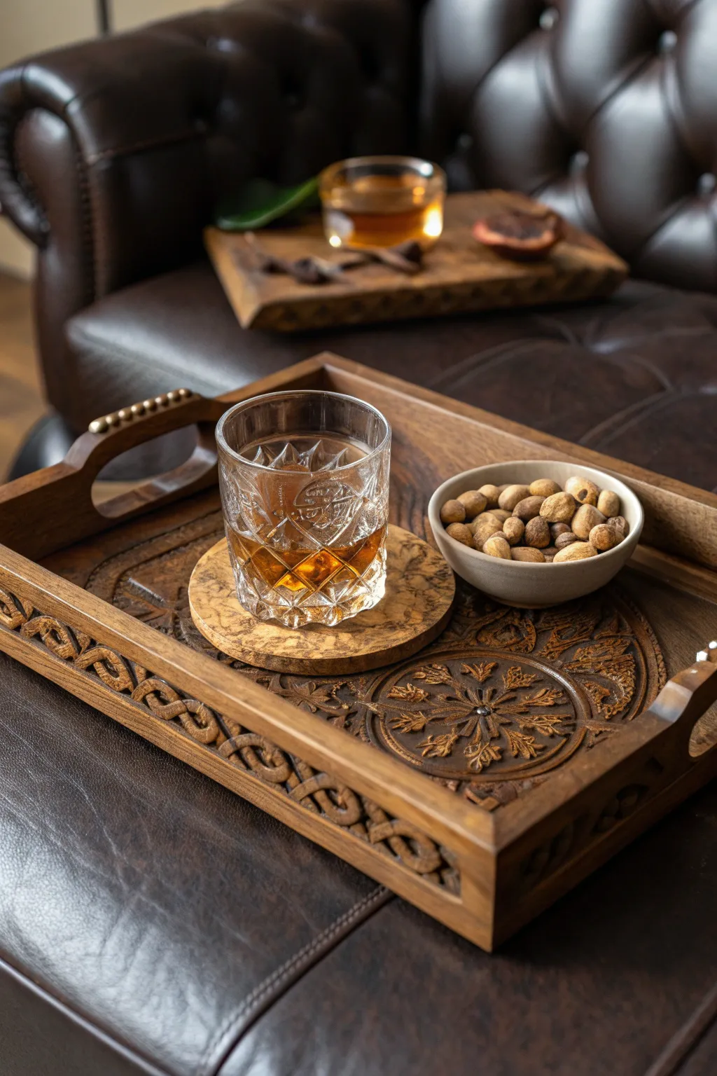 • Carved Wooden Tray with Handles: Add sophistication to your couch setup using this carved wooden tray, ideal for organized serving.