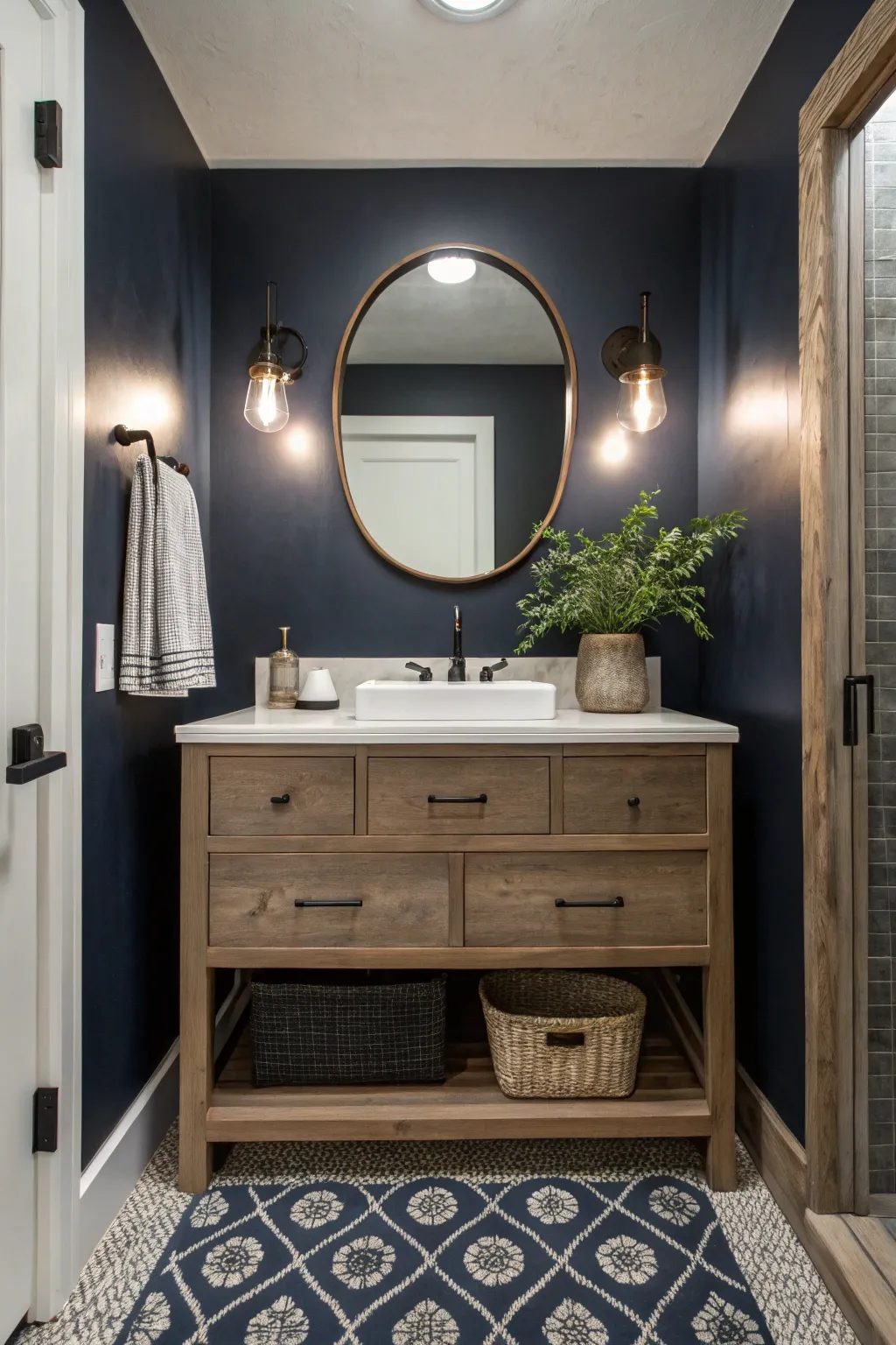 Navy accents around a dark vanity create a layered, moody environment. It’s a bold choice that adds depth and interest to your space.