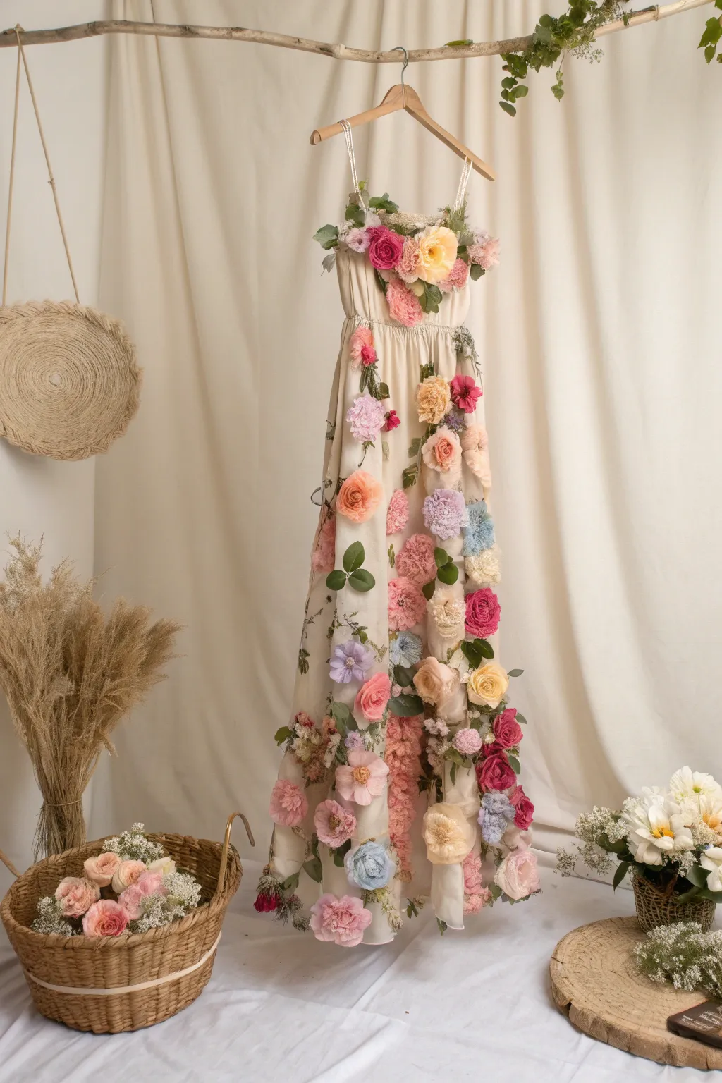 Create a whimsical look with a dress covered in faux flowers. I glued flowers from the dollar store onto a thrifted dress, and it was a hit!