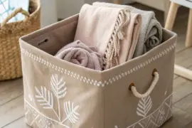 Add a cozy touch with fabric labels. Sew or glue them onto fabric bins for a soft, homey feel that’s both stylish and functional.