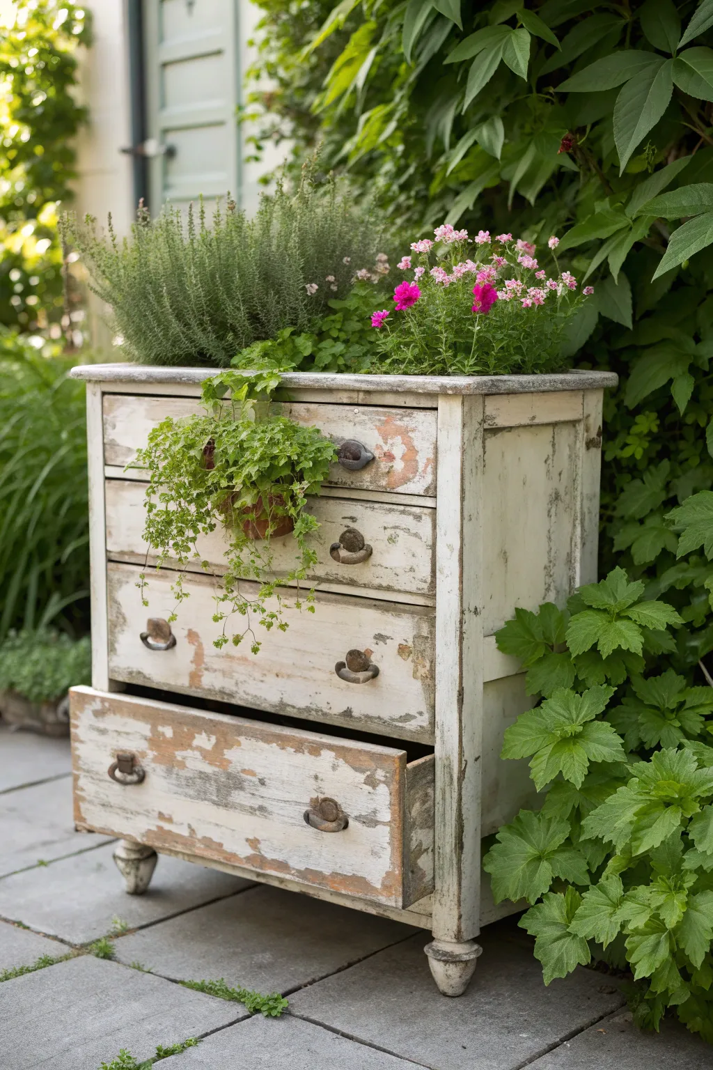Use weathered dressers as planters or additional storage. I adore how a faded dresser brings character to my garden.
