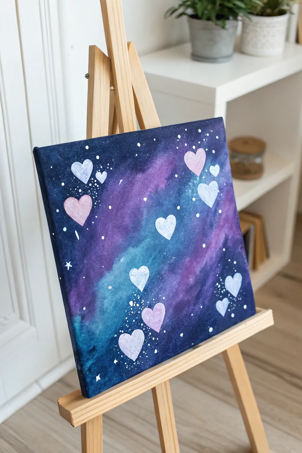 Blend blues and purples to create a cosmic backdrop with hearts scattered across the sky. I love how this combines the mystery of the universe with the simplicity of love.