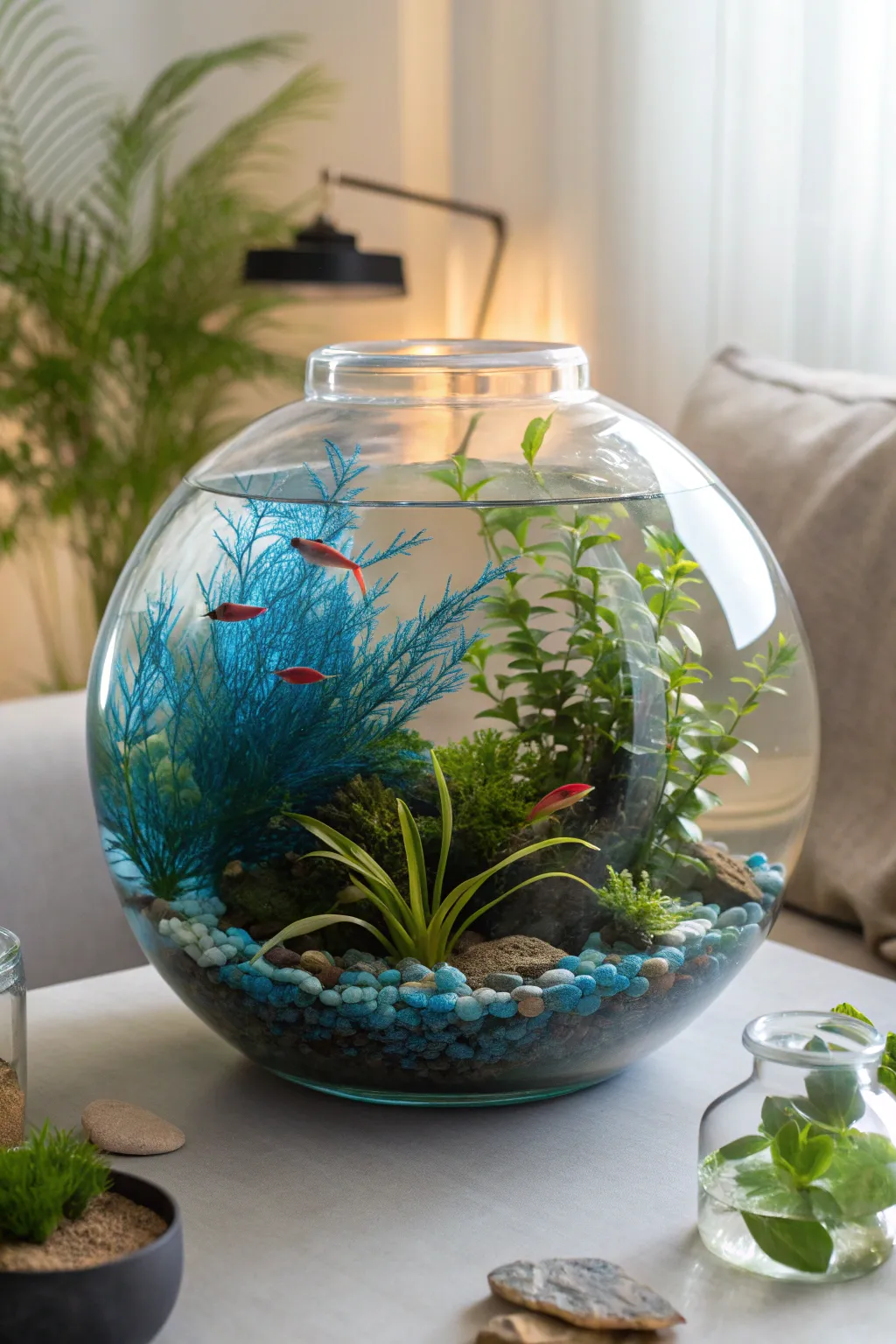 Design an underwater fantasy with aquatic plants and small fish, if your setup allows. My favorite part is watching the plants sway gently, creating a serene underwater world.