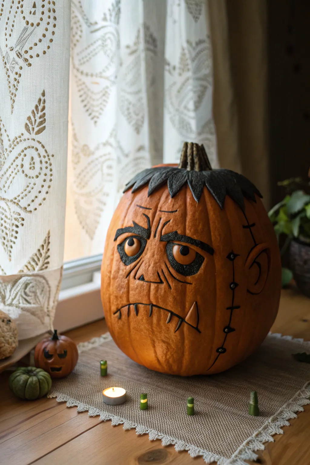 Use clay or papier-mâché to add 3D features like bolts and brows to your pumpkin. This adds a dramatic and engaging touch that stands out in any Halloween display.