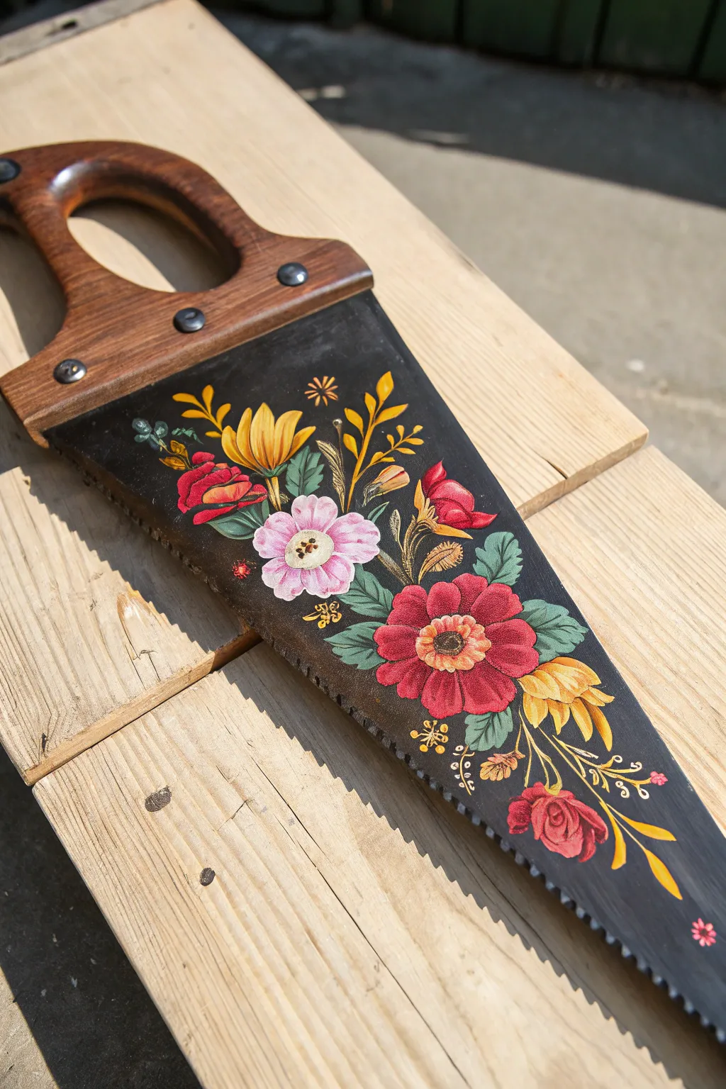 Paint some vintage botanical illustrations on your saw for a touch of elegance. I once painted delicate ferns and flowers, and they brought a timeless charm to my studio.