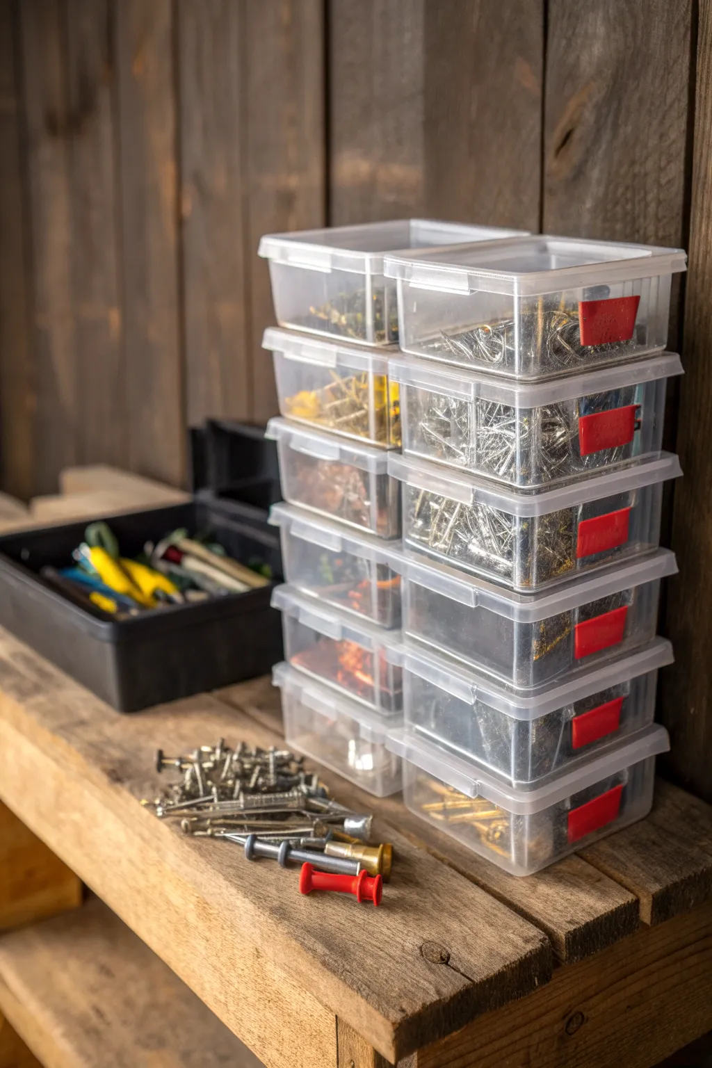 - Clear Plastic Bins with Lids: Keep your larger hardware secure and dust-free using clear bins with tightly fitting lids.