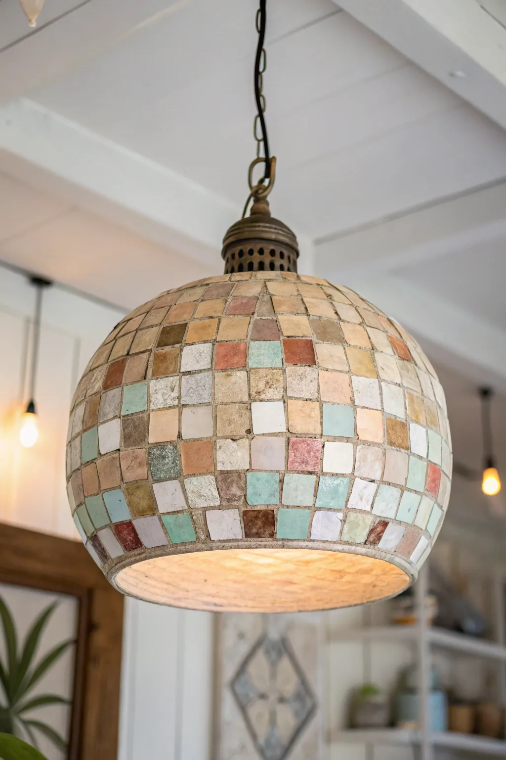 Attach tile pieces to a light fixture for a modern look. I’ve done this in my studio, and it adds a chic flair to the room.