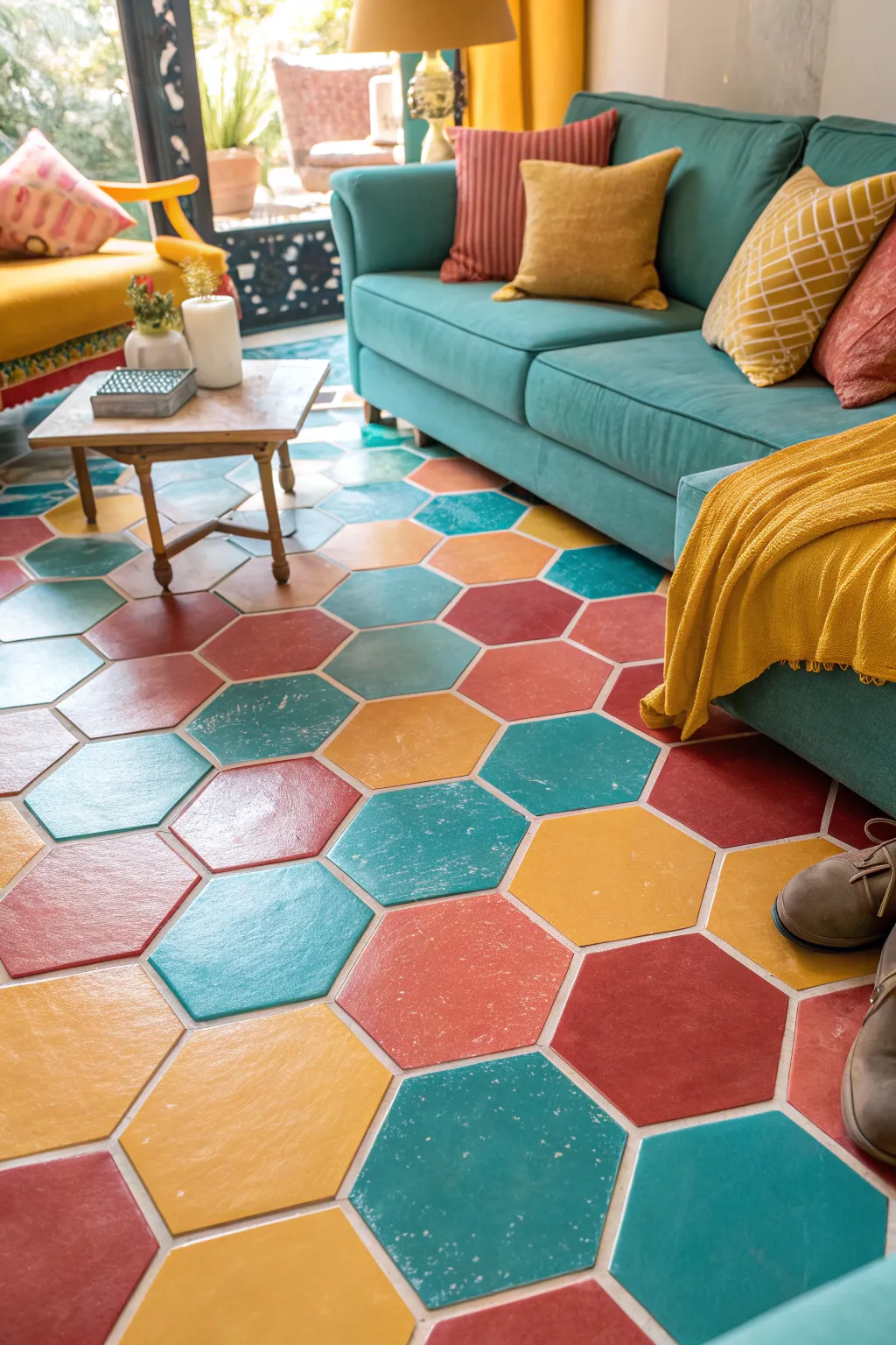 - Colorful Hexagon Floor Tiles: Brighten your living room with these vibrant hexagon tiles. Make your space truly unique!