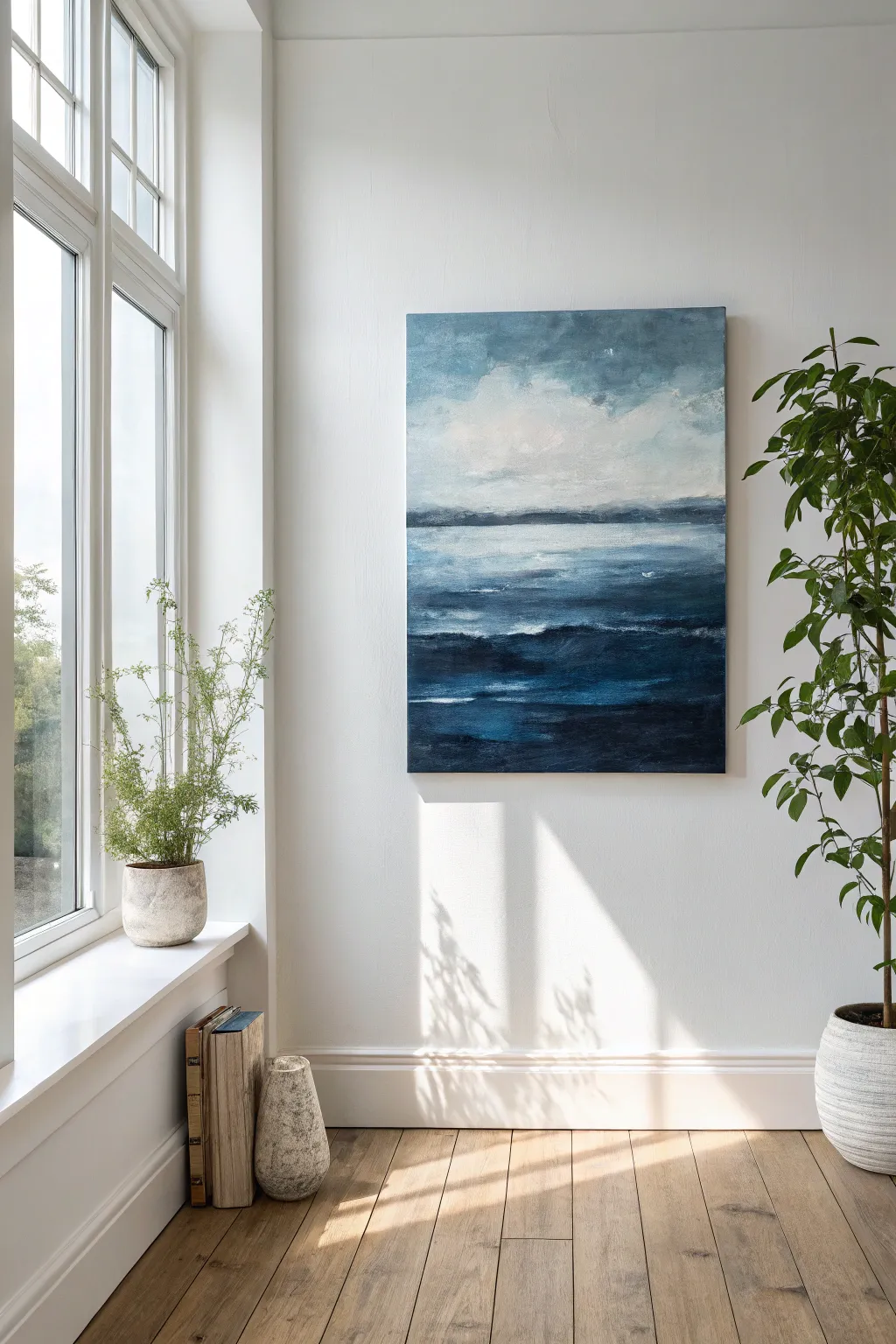 Create a statement piece with large-scale artwork that becomes the focal point of a room. I love how one big canvas can anchor the entire space.