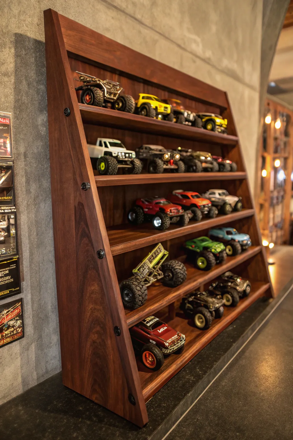 • Wooden Tiered Collectible Shelf: Create a feature wall with a wooden tiered shelf, turning your collector trucks into art.