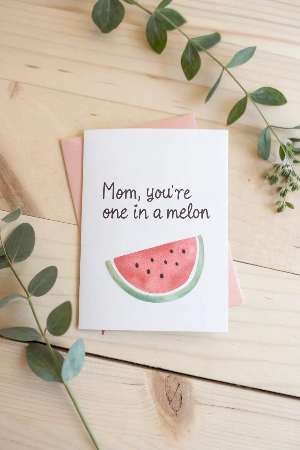 Use a vibrant watermelon design and the phrase, ‘Mom, you’re one in a melon.’ My mom loved the summery feel of this one.