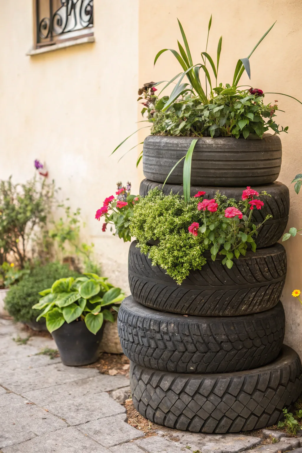 Transform old tires into stunning vertical planters for a splash of greenery and creativity!