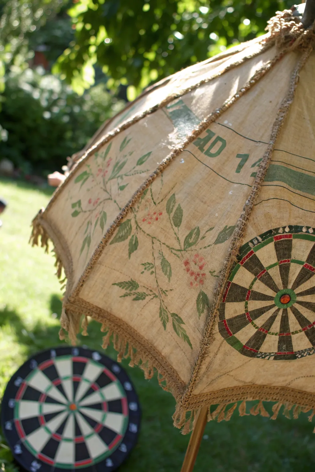Craft a DIY umbrella cover to keep your dartboard shaded and protected. I repurposed an old patio umbrella, and it works like a charm.