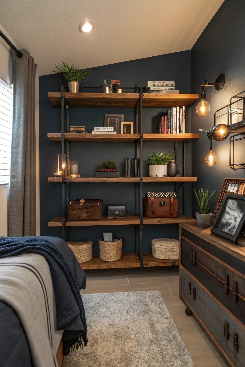- Industrial Wall-Mounted Shelving Unit: Install this industrial shelving for a stylish storage solution that maximizes your room’s floor space.