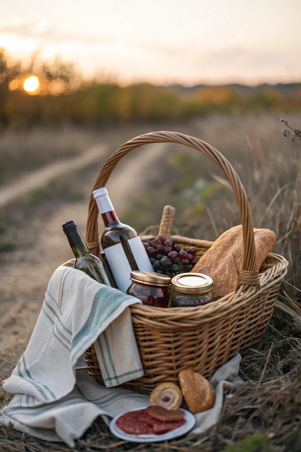 Create a picnic-themed basket with a bottle of wine, a checkered blanket, and artisanal sandwiches. Perfect for a spontaneous outdoor adventure! 🧺🍷 #PicnicVibes #OutdoorLovers