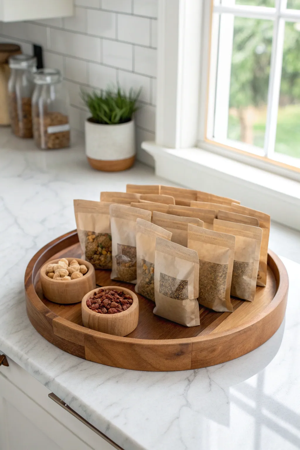 • Kraft Ziplock Bags: Store snacks conveniently in kraft ziplock bags, easily accessible from a Lazy Susan.